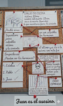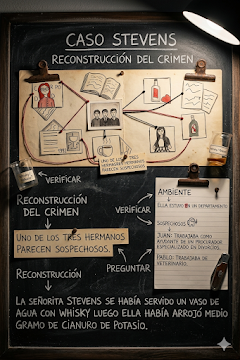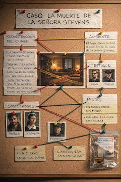 De la lectura de la primera parte, los estudiantes debían ponerse en el papel del detective encargado de develar el crimen de la Señora Steven y armar en sus carpetas un mapa de investigación basándose en las pistas, sospechosos y todo dato que encuentren relevante para acercarlos a la verdad y generar una hipótesis de lo sucedido.