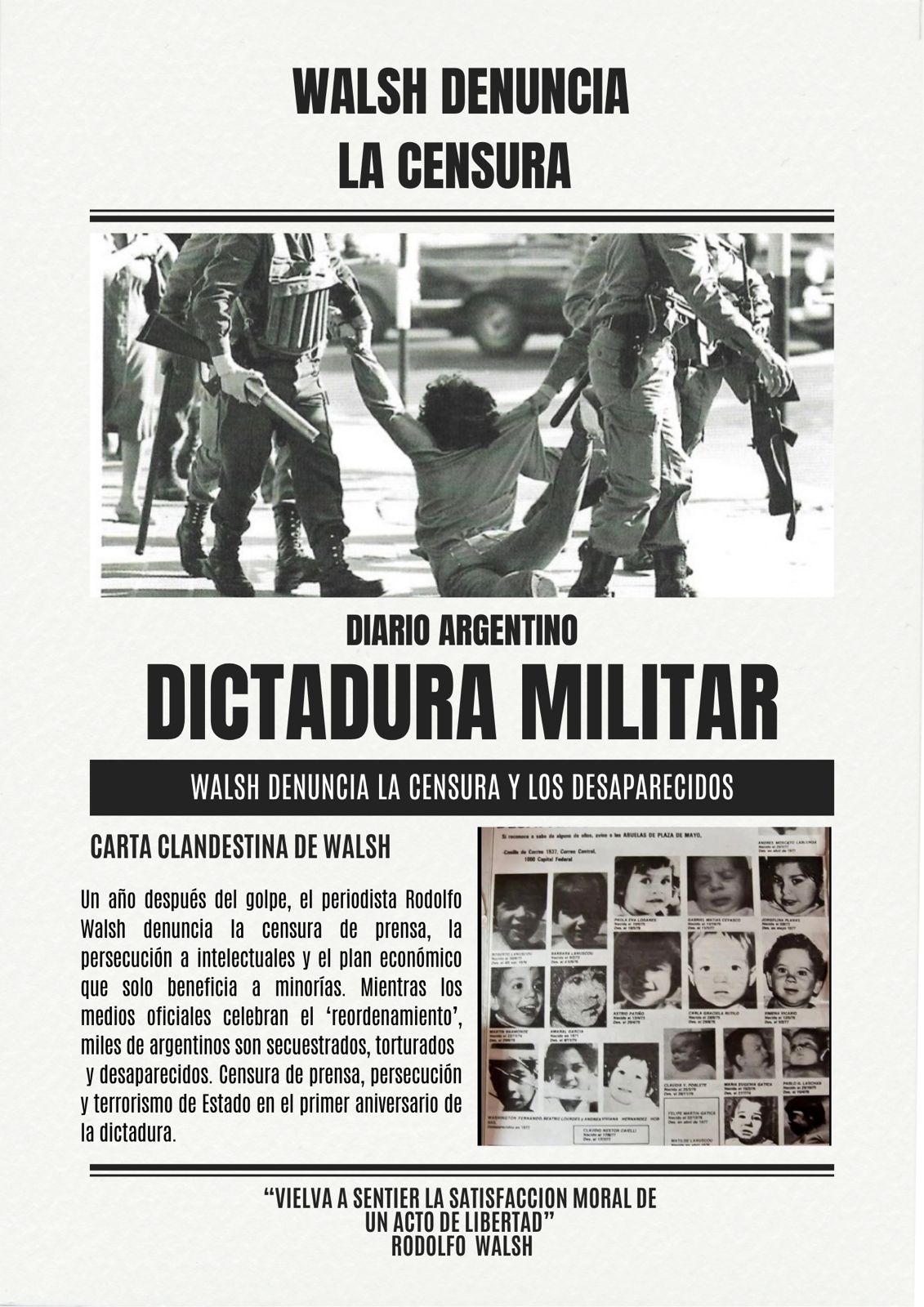 En la materia Observatorio de Medios, las y los estudiantes de 5to 2da produjeron tapas de diarios a partir de la lectura de la carta abierta de Rodolfo Walsh y cables de noticias de su agencia de noticias clandestina.